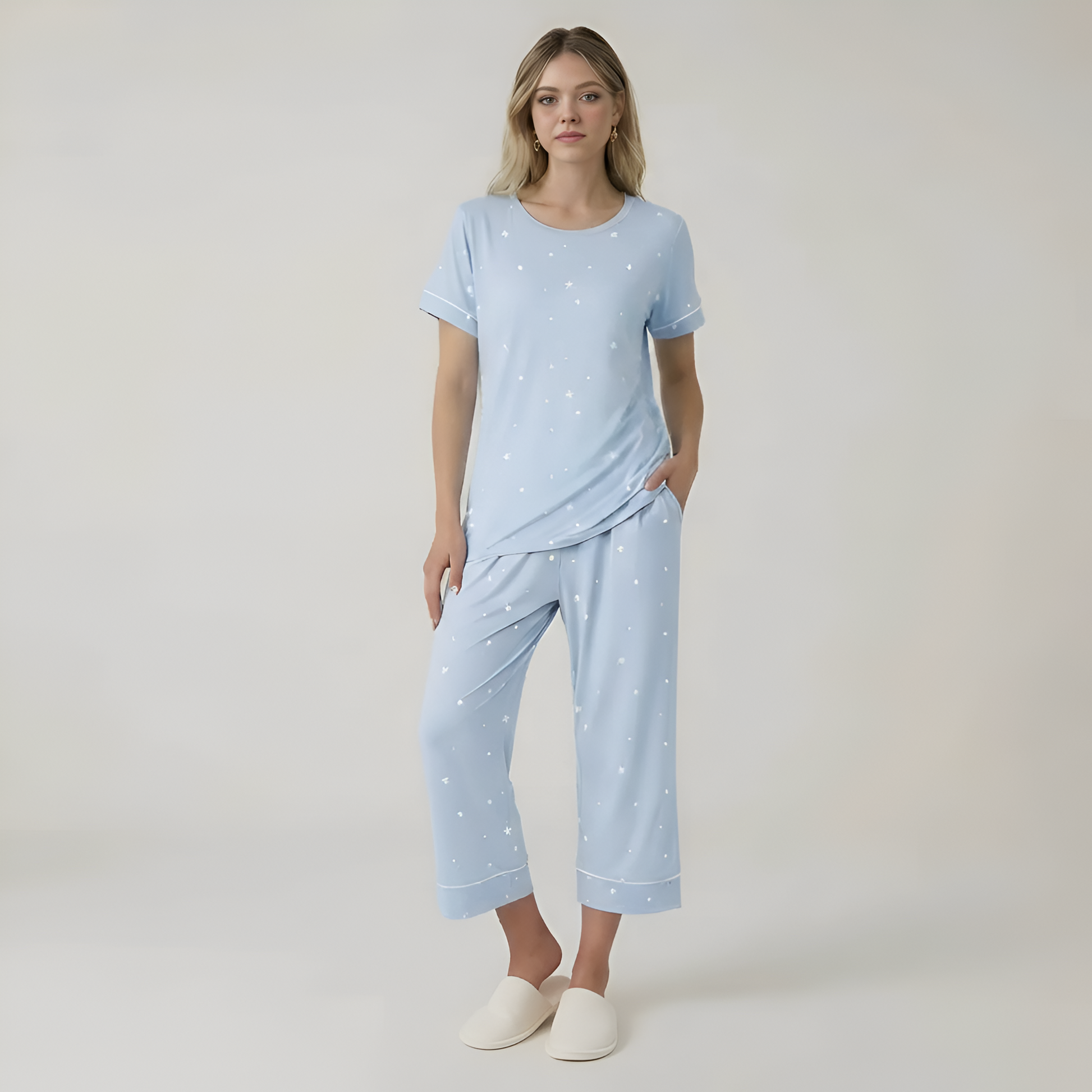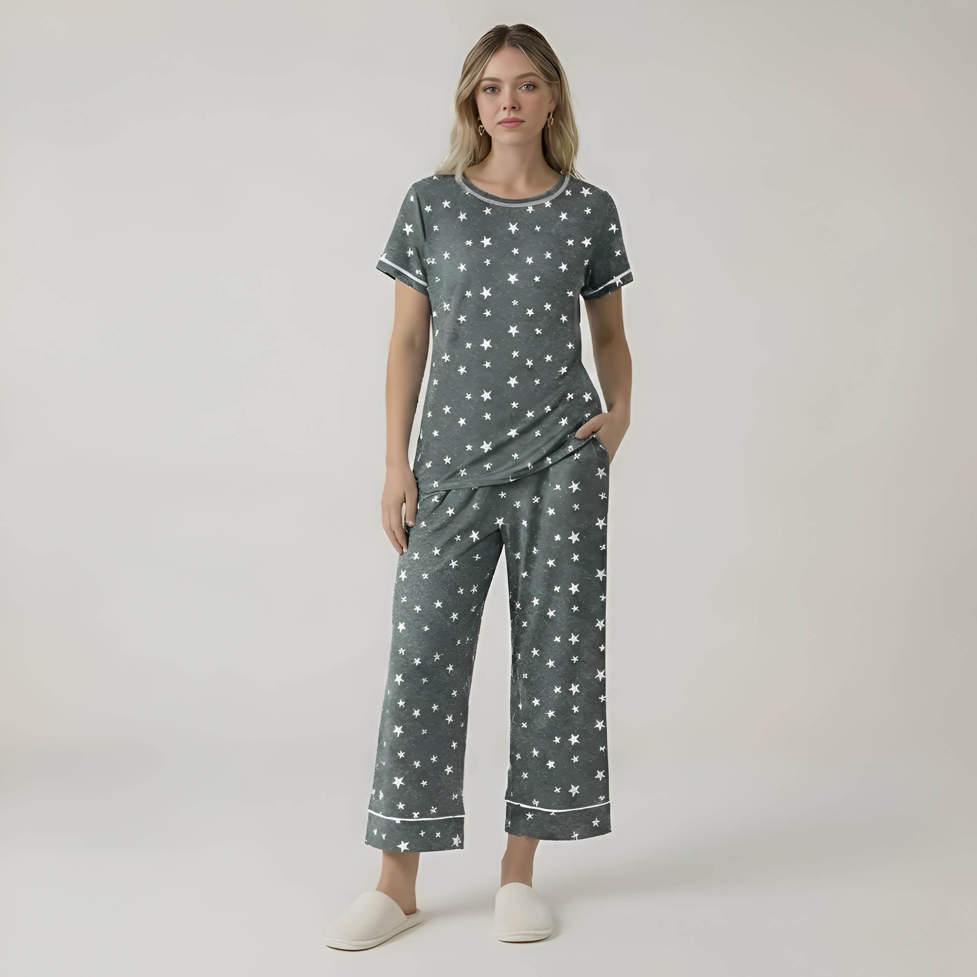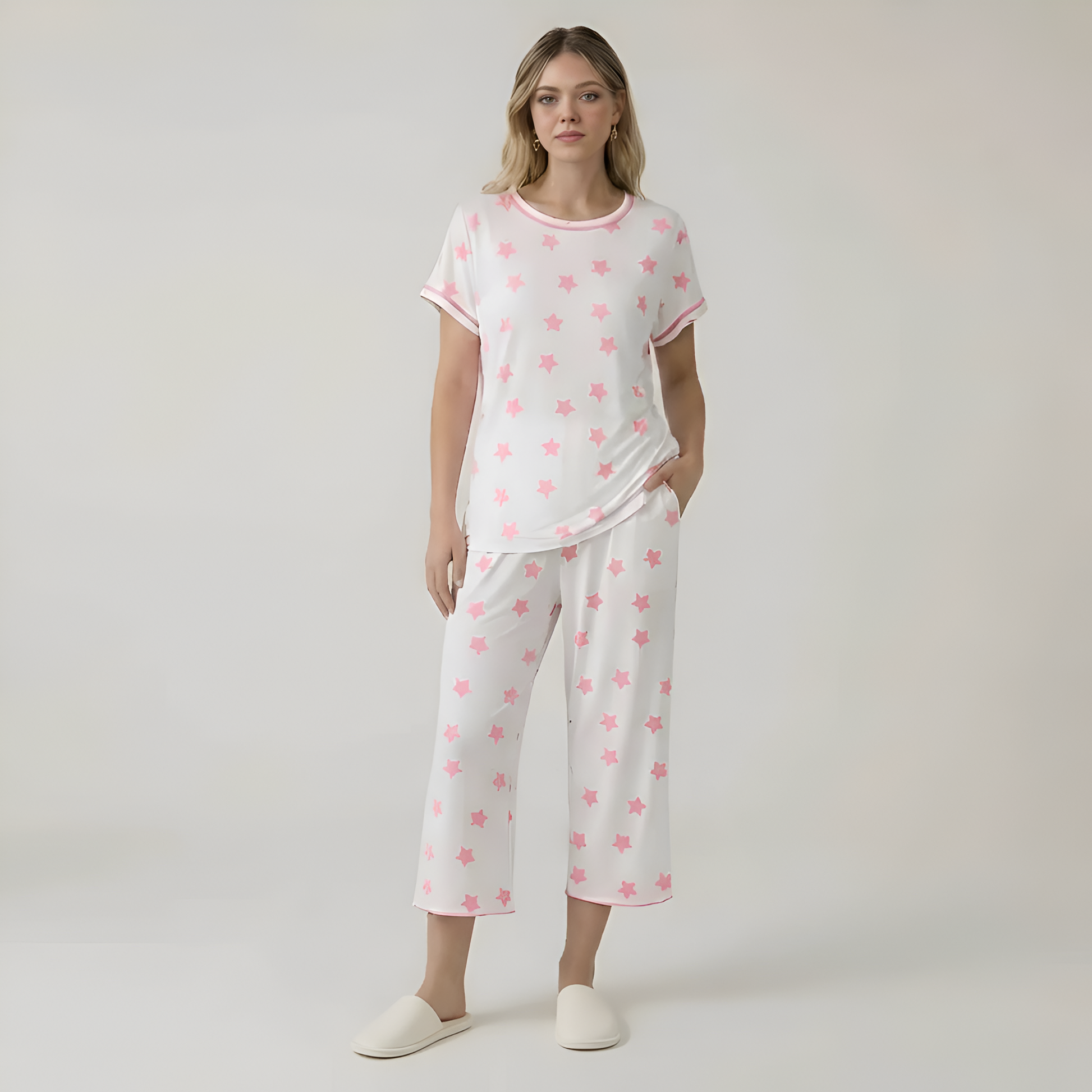Short Sleeve Star Printed Capri Pajama Set For Women